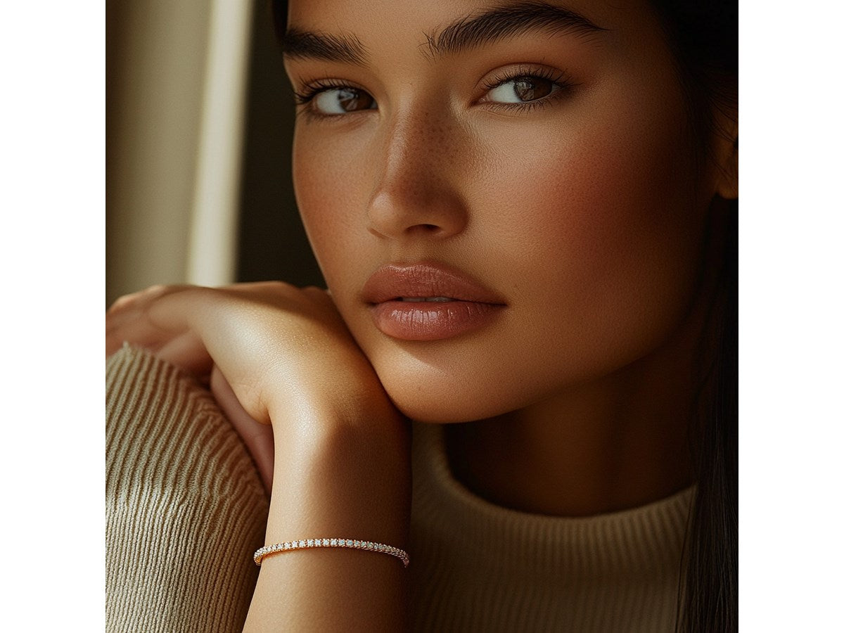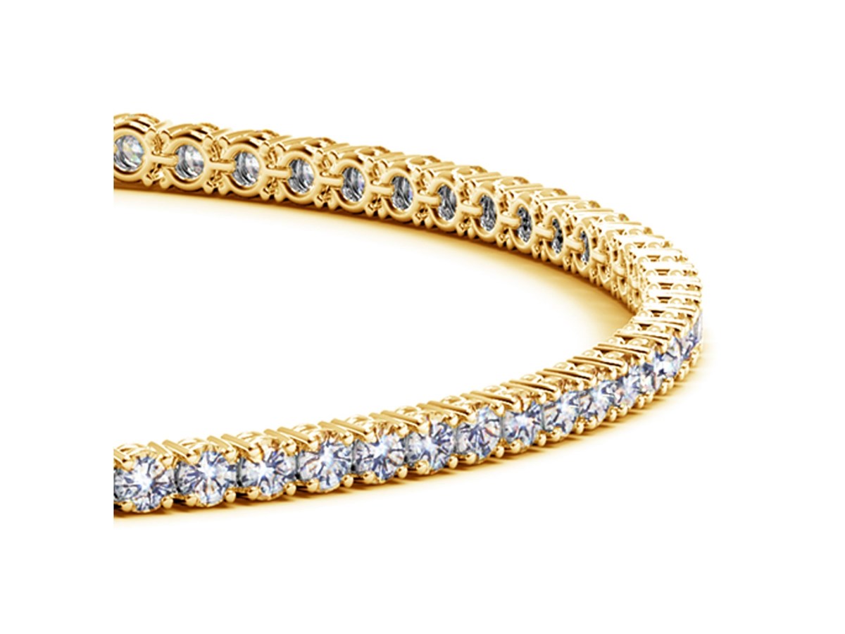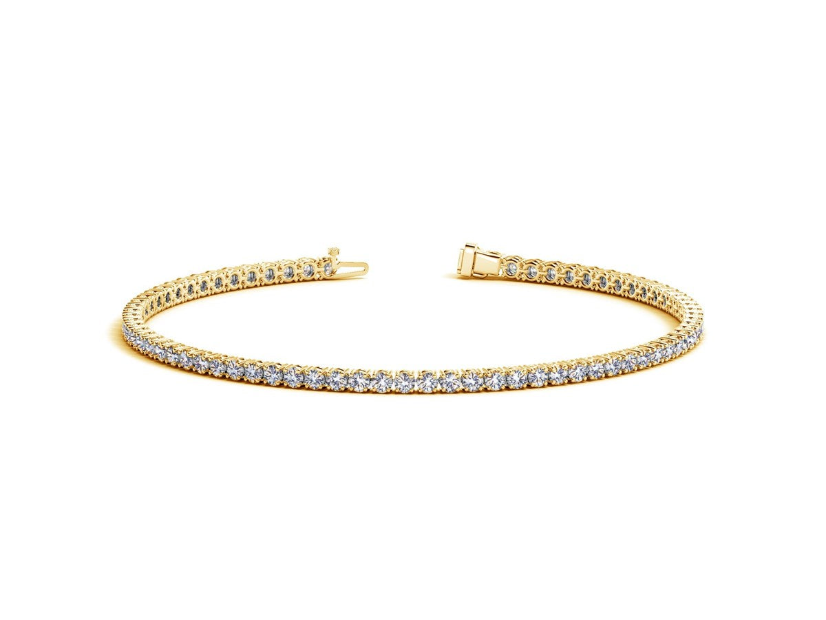 Classic four prong 2 carat total weight diamond tennis bracelet showcasing perfectly matched brilliant round cut lab grown diamonds set in 14k yellow gold.