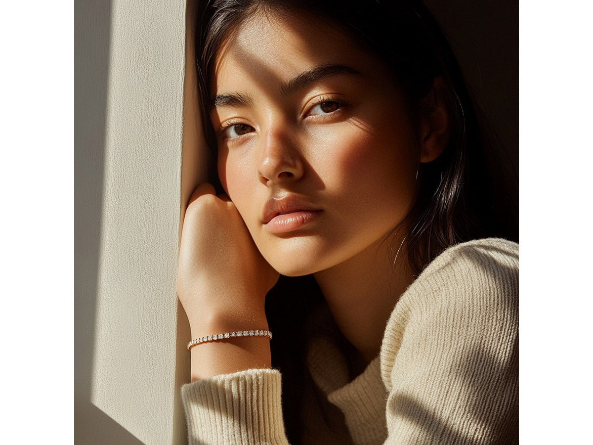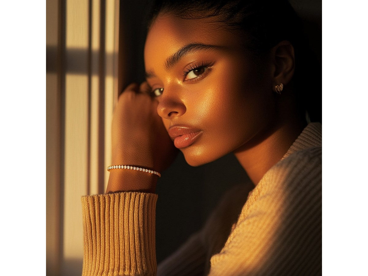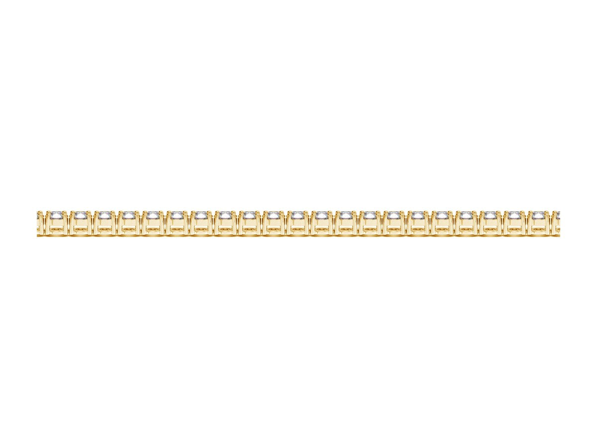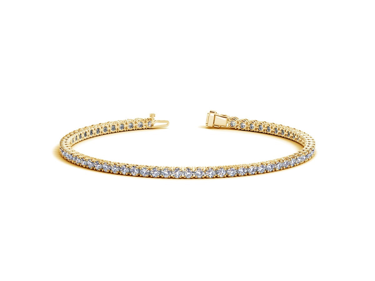 Classic four prong 3 carat total weight diamond tennis bracelet showcasing perfectly matched brilliant round cut lab grown diamonds set in 14k yellow gold.