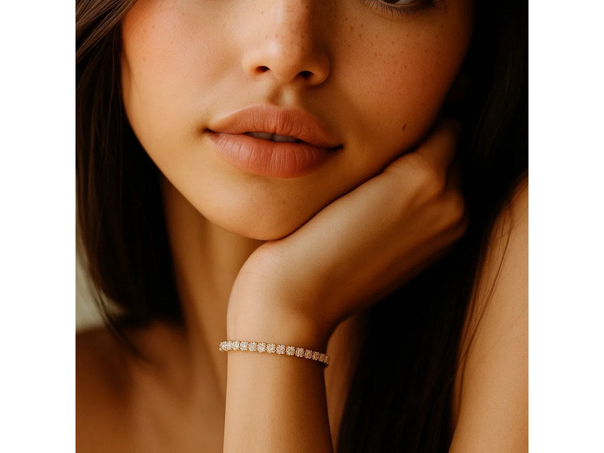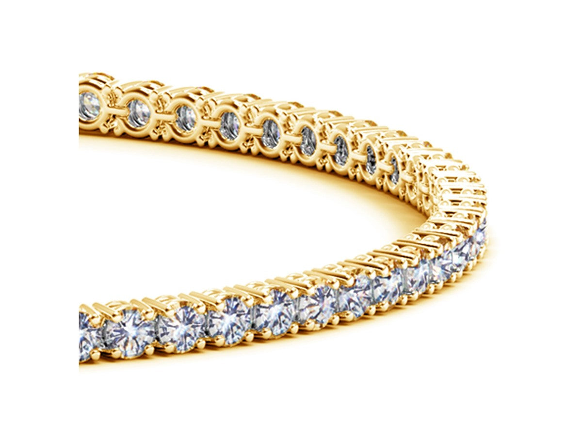 Classic four prong 4 carat total weight diamond tennis bracelet showcasing perfectly matched brilliant round cut lab grown diamonds set in 14k yellow gold.