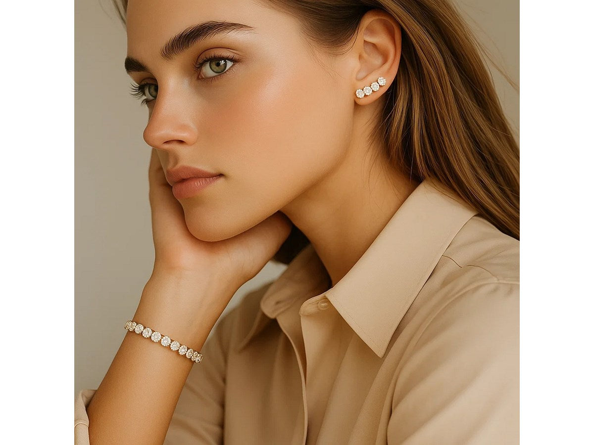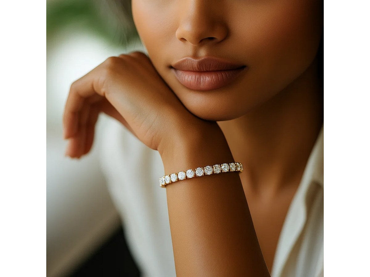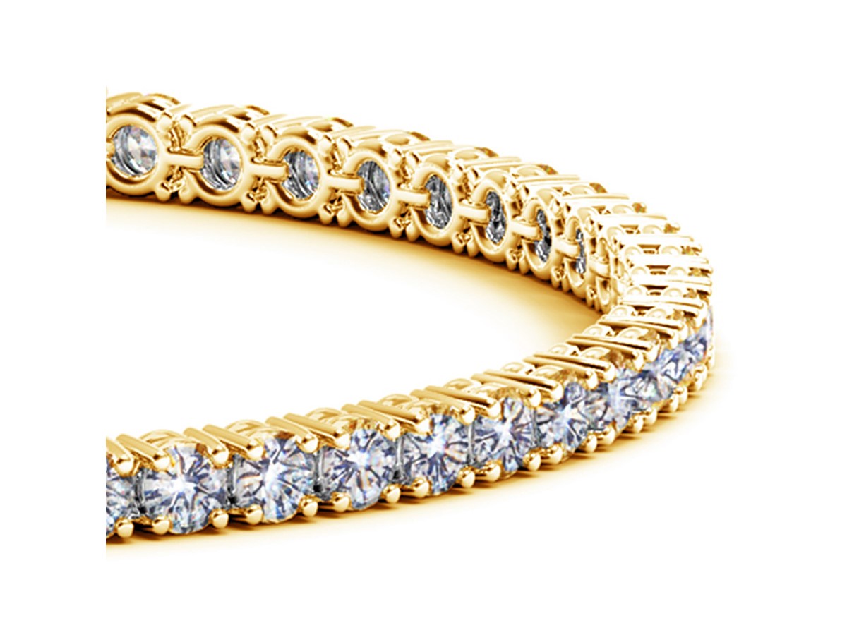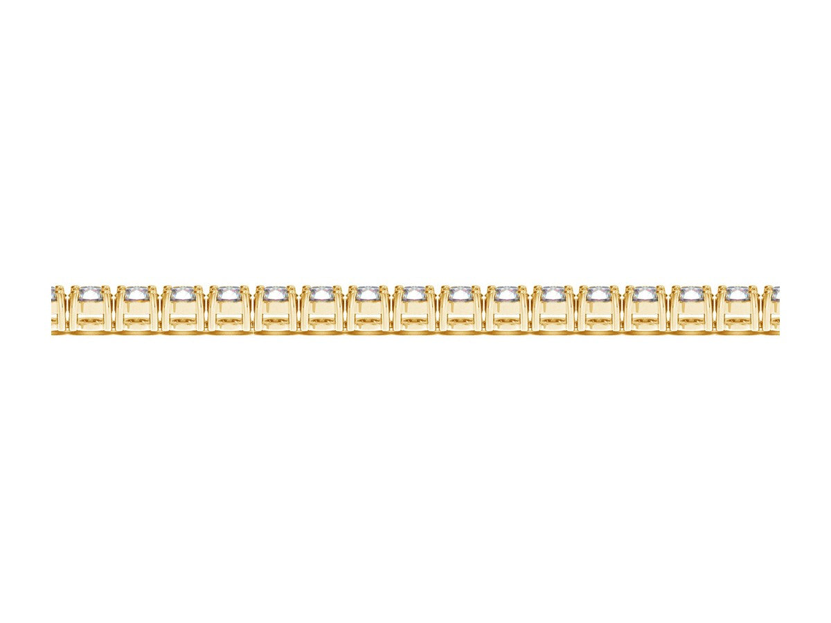 Classic four prong 7 carat total weight diamond tennis bracelet showcasing perfectly matched brilliant round cut lab grown diamonds set in 14k yellow gold.