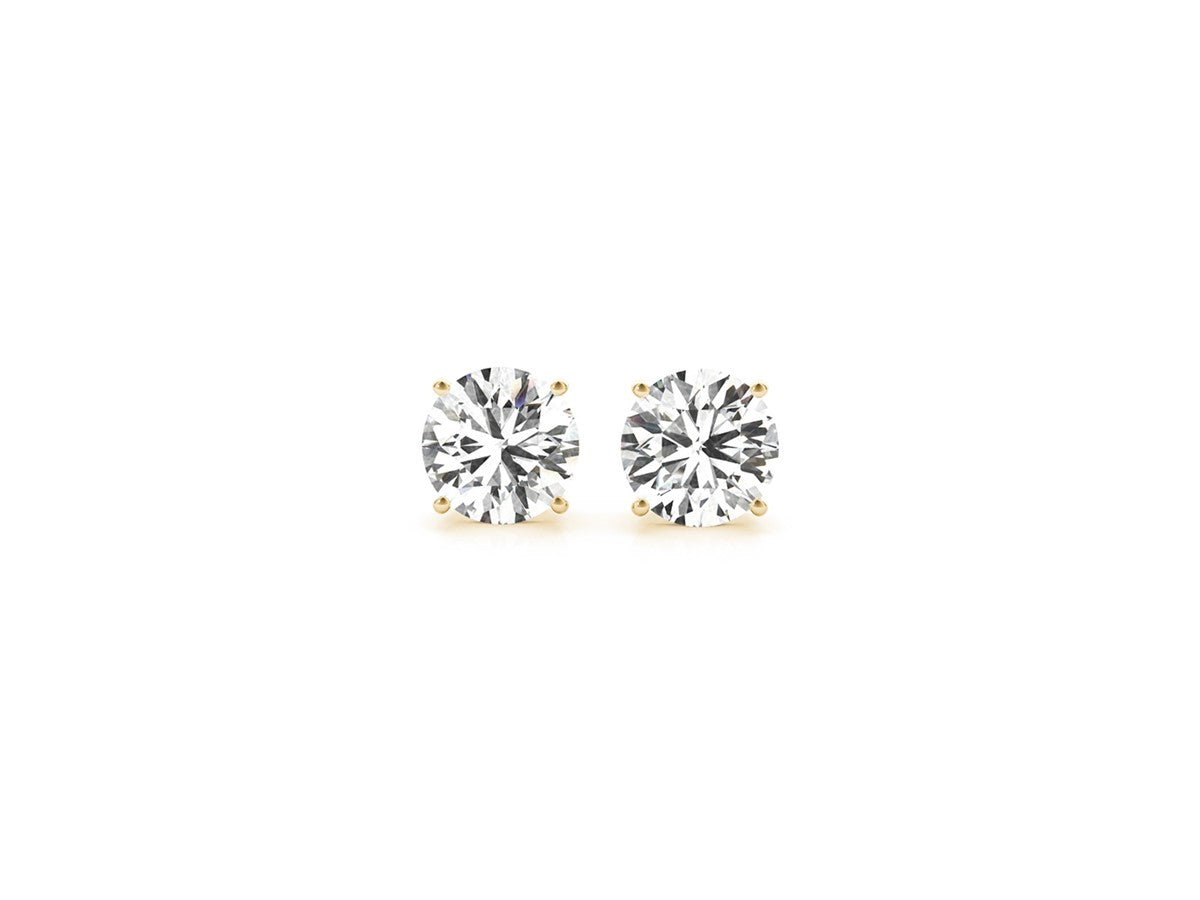Four prong 14k yellow gold stud earrings feature two perfectly matched IGI certified lab grown round cut diamonds with a total weight of 2 carat. Secured with push backs.