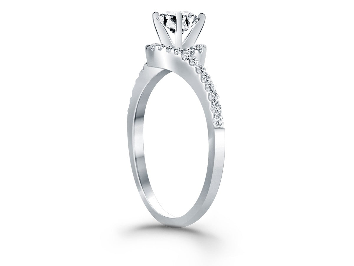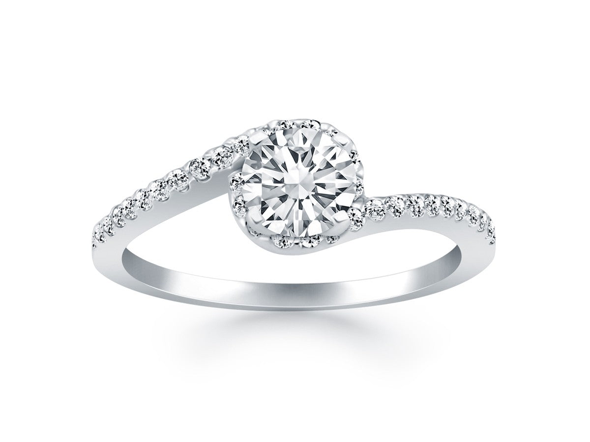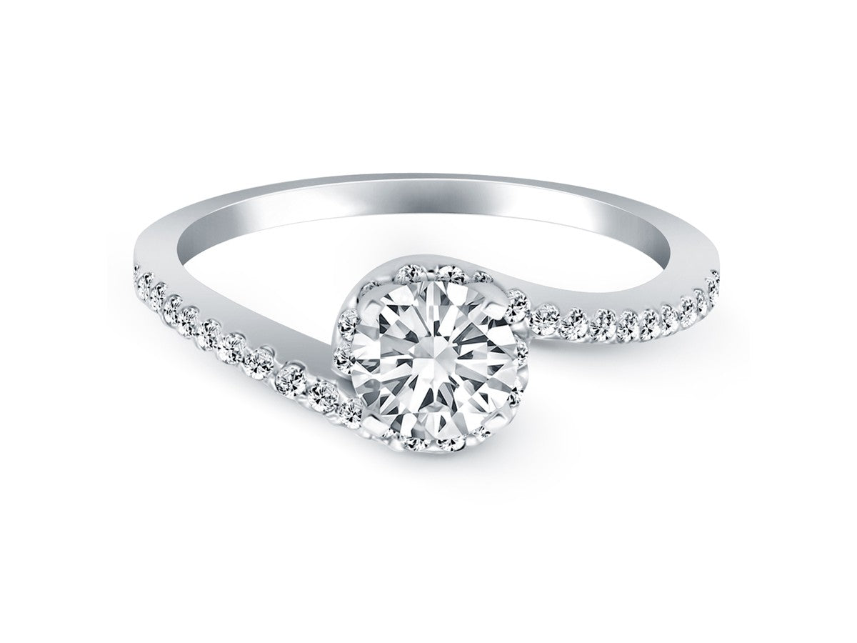The bypass shank is set with pave diamonds that swirl around the center diamond in this expertly crafted 14k white gold ring. The center highlights a sparkling 1/2 carat round cut diamond.