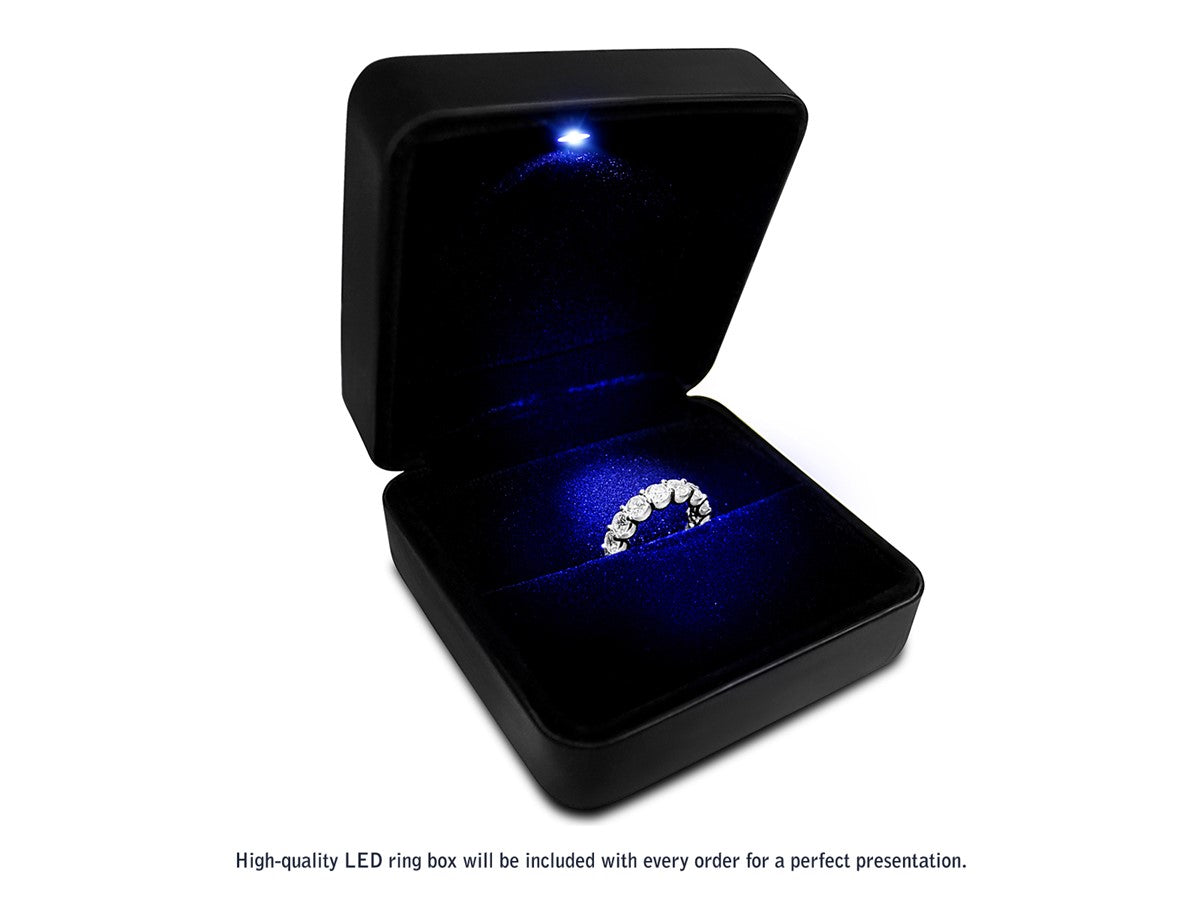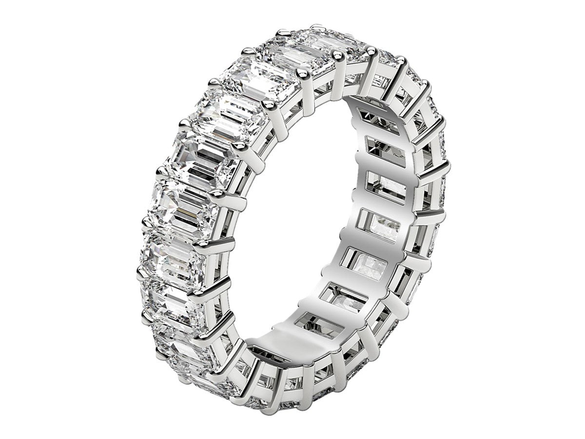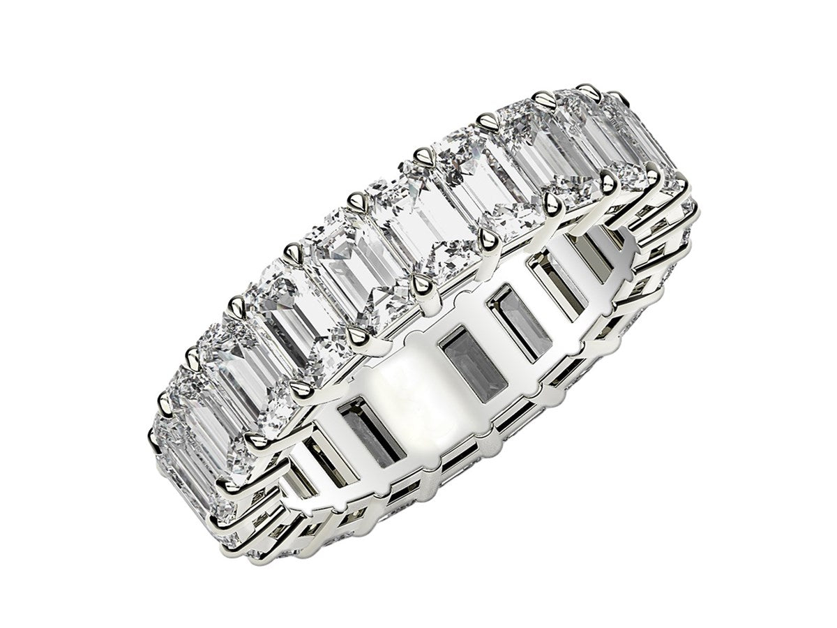 This dramatic eternity band features the traditional shine of 14k white gold, and the unparalleled sophistication of beautiful prong-set emerald cut lab grown diamonds. The light it radiates is as eternal and bright as the emotion it symbolizes.