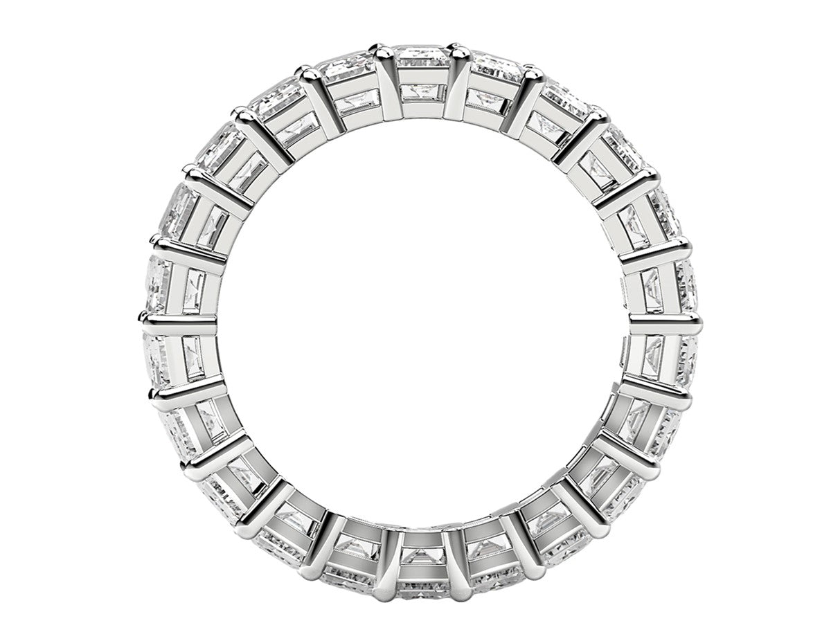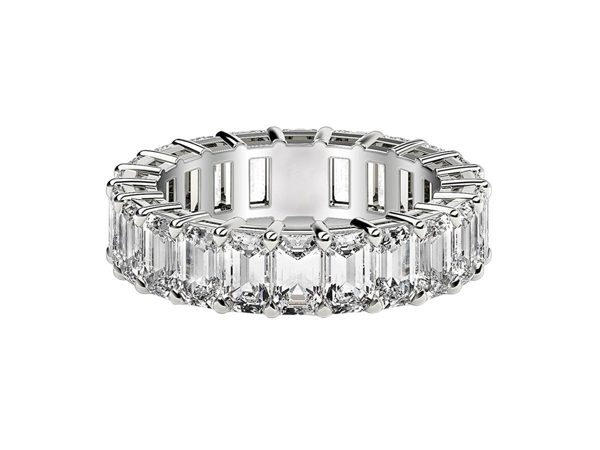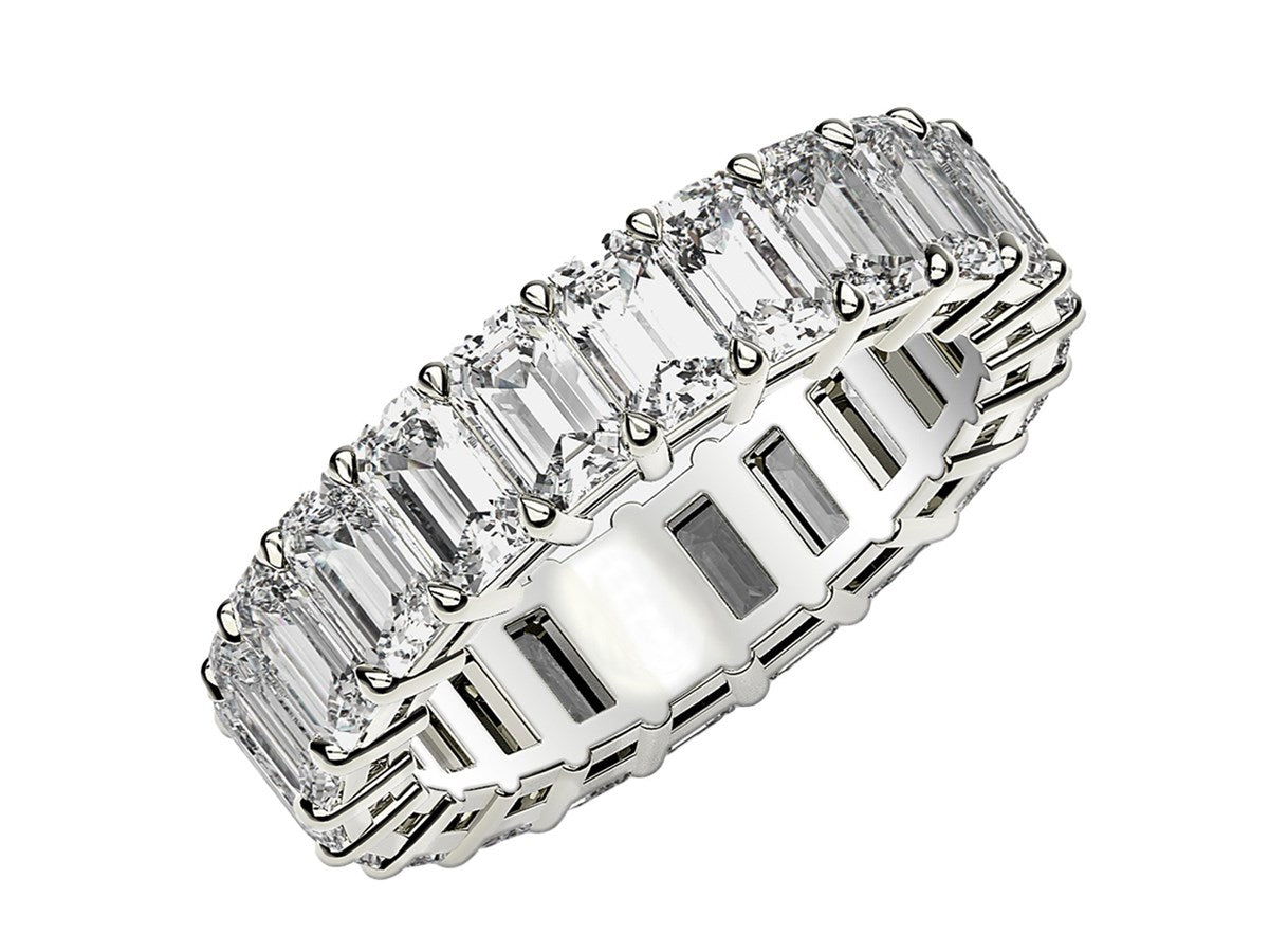 This dramatic eternity band features the traditional shine of 14k white gold, and the unparalleled sophistication of beautiful prong-set emerald cut lab grown diamonds. The light it radiates is as eternal and bright as the emotion it symbolizes.