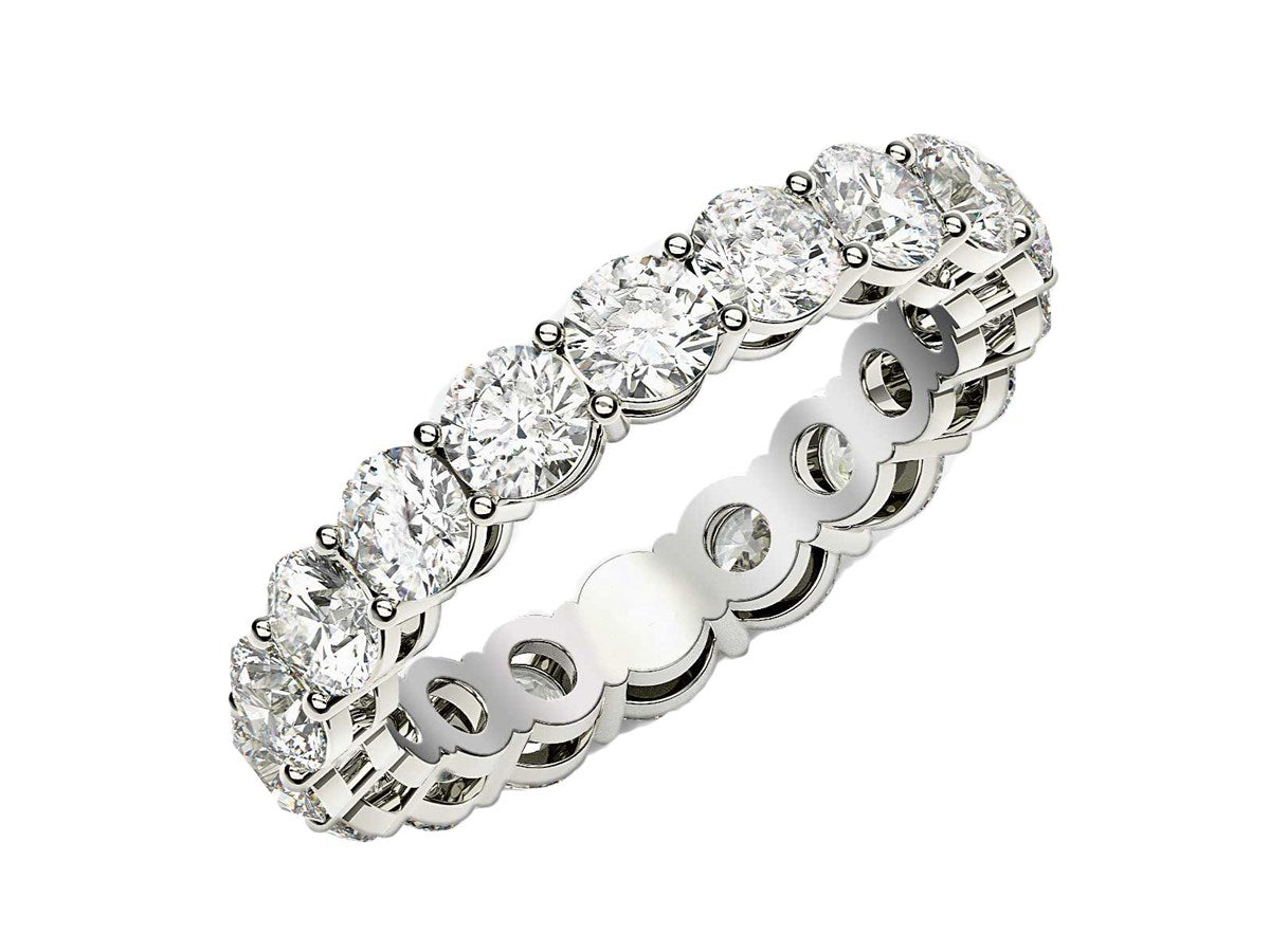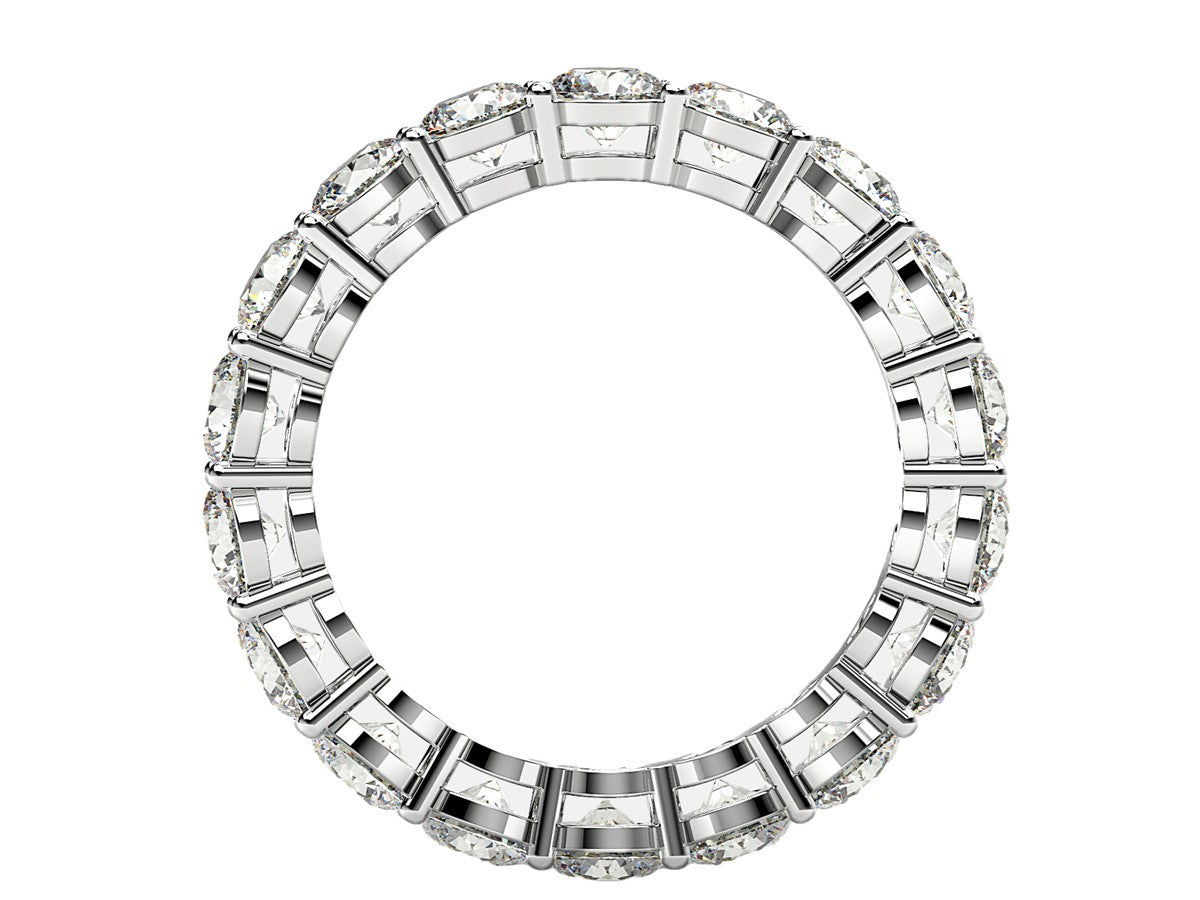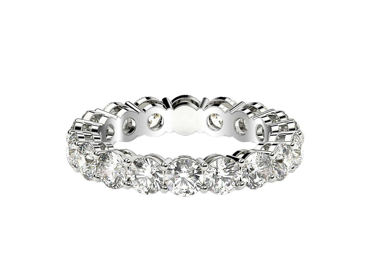 This timeless common prong eternity ring set in 14k white gold features the sparkle of brilliant round cut lab grown diamonds, while open gallery sides allow additional views of the stones.