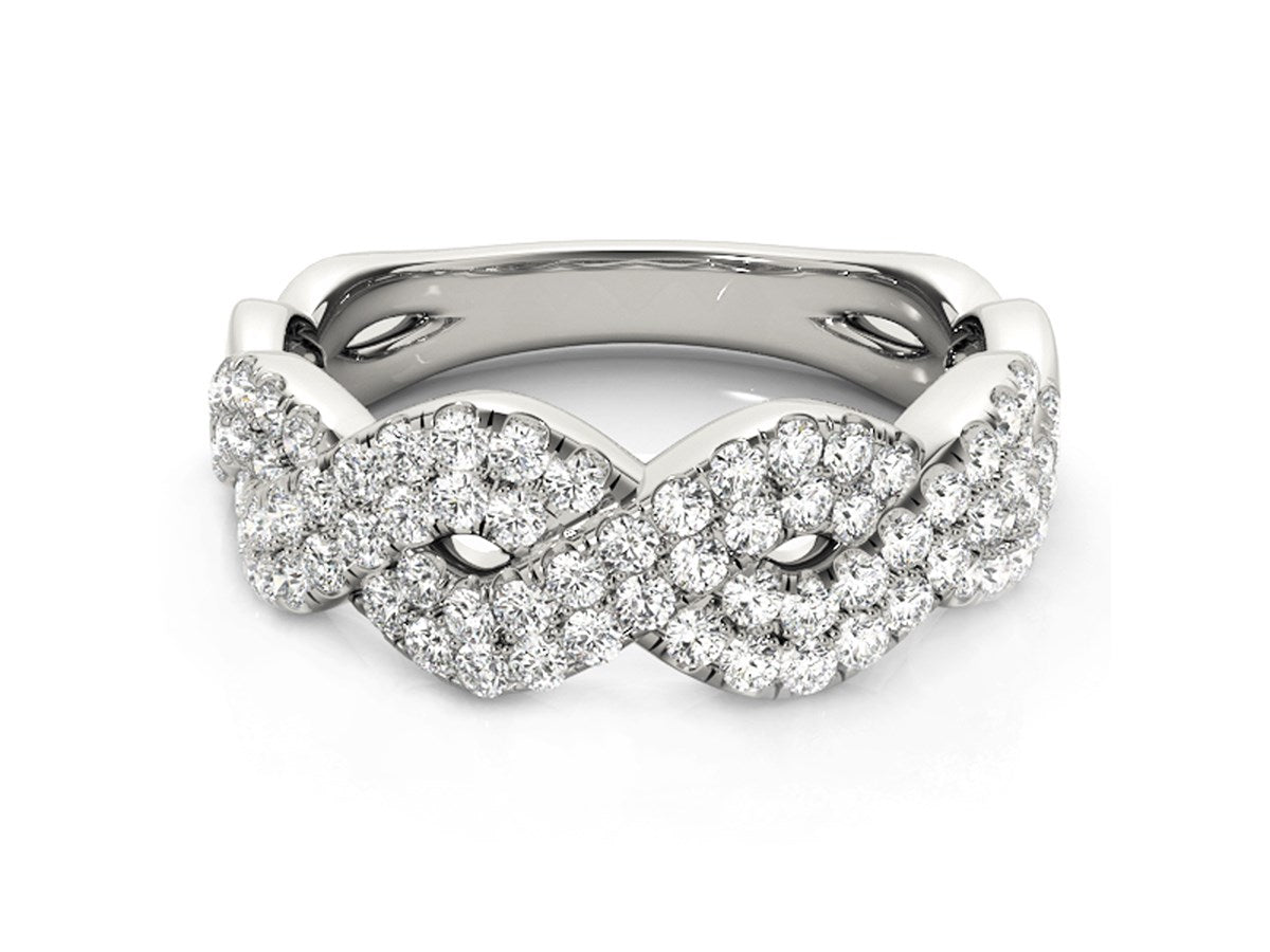 This unique ring makes a statement with two wide wavelike paths of diamonds set in 14k white gold.